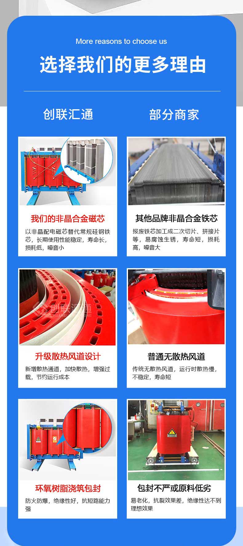 答 創(chuàng)聯(lián)匯通主營產(chǎn)品有:S11(13)、S20(22)新能效及SH15系列10KV級~110KV級油浸式電力變壓器、有載調(diào)壓電力變壓器、非晶合金變壓器、SC(B)10 (13)、SG(B)10(13)及SC(B)14(18)新能效系列干式變壓器、開關(guān)柜及組合式變壓器、箱式變電站及防竊電、礦用、整流、電爐等特殊電力變壓器。產(chǎn)品廣泛用于電力、核電站、交通、礦山、冶金、建...